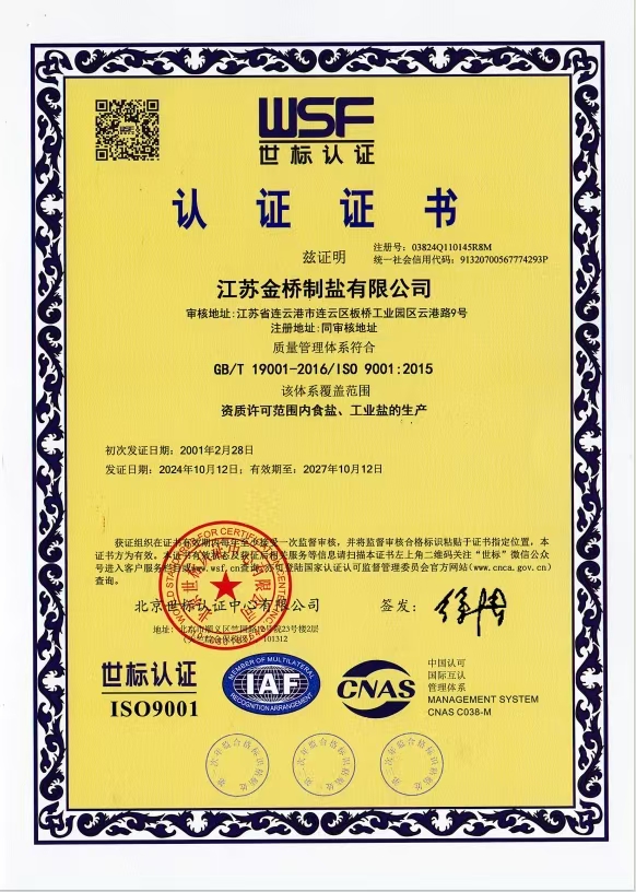 • 江蘇金橋制鹽公司通過管理體系審核認(rèn)證